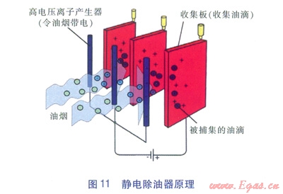 靜電除油器(見圖11),其原理是油煙進(jìn)入高壓電場,使油煙粒子帶電,在電場力作用下凝聚成油滴,沉積在收集板上,經(jīng)重力自流從而得到凈化。凈化過程的分離力直接作用于油煙粒子上,而不是作用于整個氣流上。因此,靜電除油器具有凈化效率高、壓降小的特點。收集板是其中一個非常重要的部件,須定期清理以確保靜電除油器的性能。