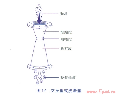 文丘里式洗滌器(見圖l2)由三段組成:漸縮段、咽喉段和漸擴(kuò)段。把油煙氣流壓入文丘里式洗滌器,當(dāng)油煙進(jìn)入漸縮段后,流速增大,進(jìn)入咽喉段時達(dá)到最大值。洗滌液噴霧則從咽喉段加入,將其清洗。在漸擴(kuò)段,流速減小,壓力回升,油煙粒子凝聚成直徑較大的液滴,進(jìn)而被收集。