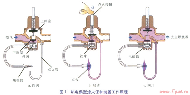 熱電偶熄火保護(hù)裝置是利用火焰的溫度升高特性,當(dāng)熱電偶感應(yīng)火焰的溫度而產(chǎn)生電動勢,作為執(zhí)行機(jī)構(gòu)的電磁鐵受電動勢推動保持燃?xì)忾y打開,燃?xì)饬飨蛑魅紵?;?dāng)燃具點火失敗或火焰熄滅時,電動勢消失,電磁鐵受彈簧作用推動燃?xì)忾y切斷燃?xì)馔贰?span lang="EN-US">