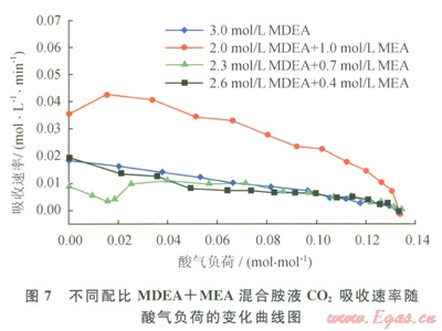 圖6為不同配比MDEA+MEA混合胺液CO2吸收速率的變化曲線圖,圖7為不同配比MDEA+MEA混合胺液CO2吸收速率隨酸氣負(fù)荷的變化曲線。從圖6、7可以看出,不同配比MDEA+MEA混合胺液隨吸收反應(yīng)的進(jìn)行,酸氣負(fù)荷逐漸增大,CO2吸收速率逐漸減小至0。MDEA/MEA配比為2.0/1.0的混合胺液CO2吸收速率明顯高于其他配比混合胺液;MDEA/MEA配比為2.3/0.7和2.6/0.4的混合胺液CO2吸收速率變化趨勢(shì)非常接近,與MDEA單一胺液CO2吸收速率相差不大。由此說明,2mol/L的MDEA溶液中加入1mol/L的MEA,其CO2吸收性能顯著提高,MEA添加量較小時(shí)對(duì)MDEA的CO2吸收性能并無改善。因此,MEA作為MDEA的添加劑時(shí),需要較高MEA/MDEA配比才能使混合胺液表現(xiàn)出更好的CO2吸收性能。