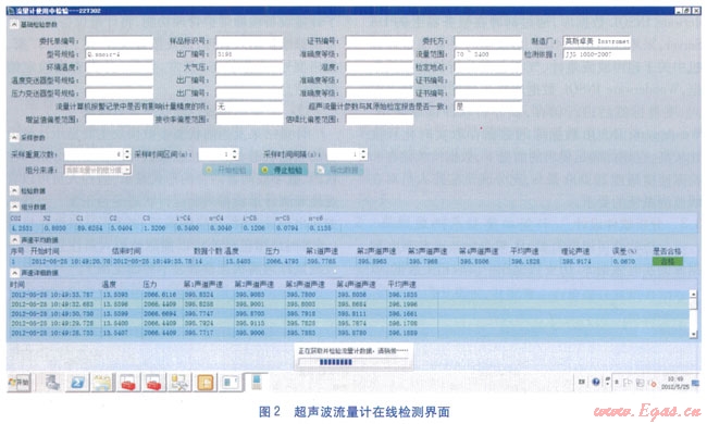 在線(xiàn)監(jiān)測(cè)系統(tǒng)根據(jù)JJG l030—2007《超聲波流量計(jì)》中有關(guān)以聲速比較為基礎(chǔ)的在線(xiàn)檢測(cè)相關(guān)要求,內(nèi)置了AGAl0聲速計(jì)算模塊,可一鍵完成對(duì)超聲波流量計(jì)的在線(xiàn)檢測(cè)。超聲波流量計(jì)在線(xiàn)檢測(cè)界面見(jiàn)圖2。