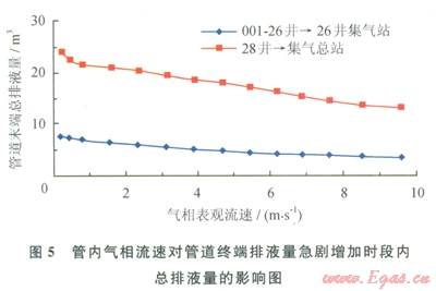 2)對管道終端總排液量的影響。清管過程中2條管道終端在排液量急劇增加時段內(nèi)的總排液量如圖5所示。由圖5可知,不同氣相流速對清管過程中管道終端排液量急劇增加時段內(nèi)總排液量的變化將產(chǎn)生顯著影響。隨著管內(nèi)氣相流速的增大,管道終端總排液量呈現(xiàn)逐漸遞減的趨勢,這是由于隨著管輸量的增加,管內(nèi)氣流速度增大,氣體的攜液能力增強,管內(nèi)總積液量減少,因而清管過程中管道終端總排液量也將減少。