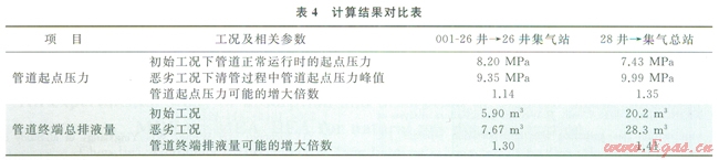 由表4與圖8、9可知,當(dāng)管內(nèi)氣相流速與氣液比均減小時,清管過程中管道的起點壓力峰值和終端排液量均將增大,但不同管道的增大幅度并不一致,體現(xiàn)出的基本規(guī)律為:管道越長或高程差越大,清管中管道的起點壓力峰值和終端排液量增大幅度越大。其中,對管道較長高程差較大的28®集氣總站管道而言,在管道運行到后期可能遇到的惡劣工況下清管過程中管道起點壓力將比管道運行初期正常運行工況下的起點壓力增大1.35倍,而終端排液量則比管道運行初期清管過程中的排液量增大1.41倍。
