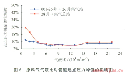 1)對管道起點壓力的影響。2條管道在不同原料氣氣液比下的管道起點壓力峰值變化情況如圖6所示。由圖6可知,原料氣氣液比也對清管過程管道起點壓力的變化具有重要影響,即:當(dāng)原料氣氣液比低于4×10m3m3時,清管過程中管道起點壓力峰值則隨原料氣氣液比的減小而快速增大,尤其當(dāng)原料氣氣液比小于1×104m3m3后,清管過程中的管道起點壓力峰值將增大到正常生產(chǎn)工況下管道起點壓力的l.11.3倍。