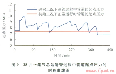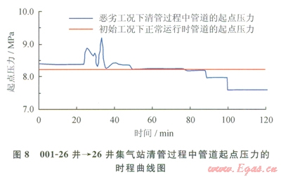 為簡化起見,僅以001-26®26井集氣站氣液混輸管道實際清管作業(yè)為例,分析清管過程中管道起點壓力、管道終端液體流量等工況參數(shù)的變化規(guī)律。