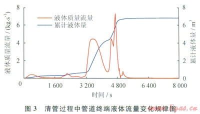 清管過程中管道終端液體瞬時質(zhì)量流量和累計液體量這2個參數(shù)是設(shè)計終端段塞流捕集器的基礎(chǔ)依據(jù),圖3給出了001-26®26井集氣站管道清管過程中終端液體流量變化規(guī)律。由圖3可知,管道終端液體瞬時質(zhì)量流量會隨著清管時間發(fā)生劇烈波動,最大值約為7kgs,可能會超過管道終端段塞流捕集器設(shè)計尺寸而出現(xiàn)溢流現(xiàn)象,特別是對于高含硫氣液混輸管道,其積液中存在高含量H2S等劇毒物質(zhì)可能會對周圍環(huán)境造成安全風(fēng)險。此外,通過模擬管道終端累計液體體積流量,可得出管道在清管過程中排液急劇增大時段內(nèi)的總排液量,可為管道終端段塞流捕集器容量設(shè)計提供參考。