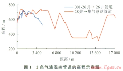 某高含硫氣田各生產(chǎn)井H2S含量的變化范圍為2.15%~2.65%,CO2含量的變化范圍為2.86%~4.03%。選取5個測試井段天然氣組分的平均含量作為原料氣干基組成數(shù)據(jù)(1)。同時以該高含硫氣田001-26®26井集氣站和28®集氣總站這2條氣液混輸管道為例,并結(jié)合這2條管道的現(xiàn)場實際生產(chǎn)數(shù)據(jù),確定相應(yīng)管道清管工況建模參數(shù)如表2所示,2條管道高程如圖1所示。