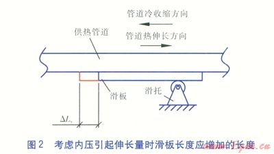 由以上分析計算可知,僅考慮升溫引起的管道熱伸長量與綜合考慮升溫引起的管道熱伸長量以及內(nèi)壓引起的管道伸長量相比,絕對誤差為-112mm,相對誤差為-11.8%。若不考慮內(nèi)壓引起的管道伸長量,易導致滑板長度設(shè)置不合理,從而引起滑板脫離滑托。