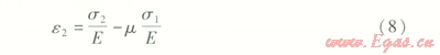 設(shè)定e2是由內(nèi)壓引起的管道軸向應變,由于s3=0,由式(6)可得到由內(nèi)壓引起的管道軸向應變e2的計算式為: