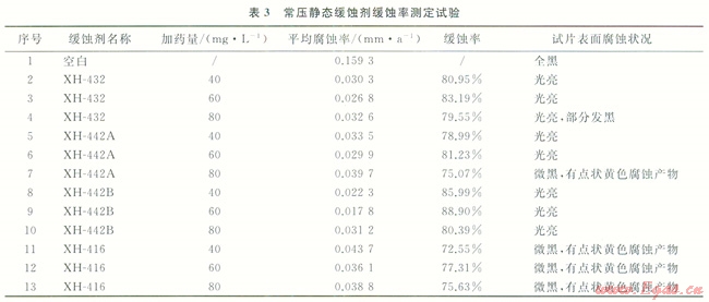 從表3可以看出,緩蝕劑XH-442B在40mg/L時具有很好的緩蝕性能,緩蝕率達86%左右。