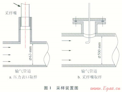 井口管道的直徑為63mm,站內(nèi)匯管管徑為500mm??紤]到站內(nèi)實際情況,井口的取樣位置選擇在流量計前的短接處,更換為專門加工帶有采樣孔的短接[7];站內(nèi)匯管取樣位置首選能夠插入采樣嘴的位置,若無此類位置供選擇,就選擇壓力表口進行取樣[8]。采樣裝置如圖1所示。
