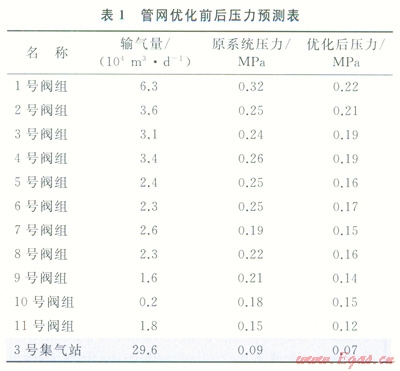 2號(hào)閥組—4號(hào)閥組—節(jié)點(diǎn)2—11號(hào)閥組建復(fù)線(圖2),管網(wǎng)優(yōu)化前后壓力預(yù)測(cè)情況見(jiàn)表1。
