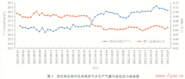 優(yōu)化調(diào)整后鄭村區(qū)塊煤層氣井日產(chǎn)氣量明顯上升,平均日增產(chǎn)氣量2.5×101 m”,集氣站進(jìn)站壓力明顯下降,由0.09MPa降至0.06~0.07MPa(圖3)。
