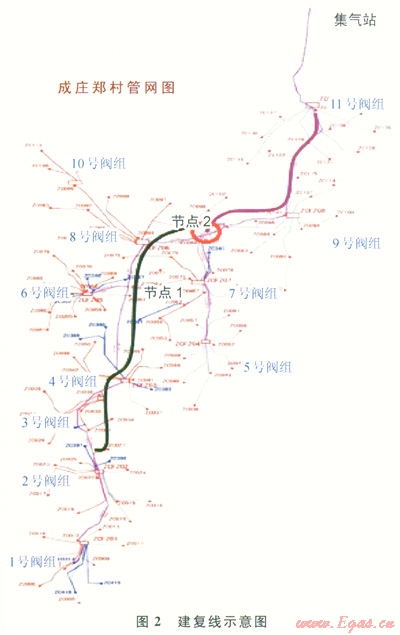 由以上計(jì)算可知,在2號(hào)閥組經(jīng)3號(hào)閥組、4號(hào)閥組、節(jié)點(diǎn)l、節(jié)點(diǎn)2、9號(hào)閥組至ll號(hào)閥組新建一條采氣干線作為復(fù)線,該復(fù)線建設(shè)后,管網(wǎng)起點(diǎn)1號(hào)閥組壓力進(jìn)行對(duì)比,壓力將從0.32MPa降低至0.22MPa,終端3號(hào)站進(jìn)站壓力可從0.09MPa降至0.07MPa,系統(tǒng)運(yùn)行壓力不均衡狀況得到大大的緩解。