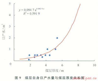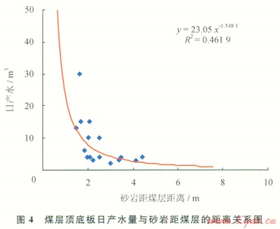 煤層直接頂?shù)装鍨樯皫r時(shí),物性較好,且砂巖厚度越大,則頂?shù)装迳皫r的含水性越強(qiáng),煤層壓裂后頂?shù)装迳皫r的地層水易于產(chǎn)出,排采出水量亦較大。如果砂巖為老頂?shù)?,但直接頂?shù)装宓哪鄮r較薄,壓裂時(shí)容易壓穿直接頂?shù)装宓哪鄮r,致使壓裂縫溝通了老頂?shù)椎纳皫r而增大出水量,且隨著砂巖距煤層越近,越易于壓穿直接頂而溝通砂巖含水層,為此,頂?shù)装迳皫r的厚度、孔隙度及距煤層的距離與煤層排采出水量有較大的關(guān)系。