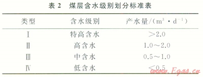 諸如上述煤層頂?shù)装搴?jí)別劃分方法,對(duì)研究區(qū)煤層含水級(jí)別進(jìn)行了劃分(表2)。