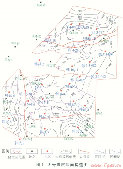 2)研究區(qū)5號(hào)煤層的排采出水量分析表明,近斷裂帶和構(gòu)造低幅度區(qū)排采出水量較大,遠(yuǎn)離斷裂帶和構(gòu)造低幅度區(qū),但頂?shù)装迳皫r含水層也會(huì)致使排采出水量增大??傮w上呈現(xiàn)南部和北部及中部韓3-2-025井區(qū)出水量較大,沿?cái)嗔褞?、?gòu)造低幅度區(qū)及頂?shù)装迳皫r區(qū)出水量較大,是排采的不利區(qū)域。