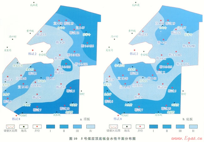 基于煤層自身產(chǎn)水量測(cè)井預(yù)測(cè)結(jié)果及上述劃分標(biāo)準(zhǔn),編繪了5號(hào)煤層含水性平面分布圖(圖11)。由圖11可知,5號(hào)煤東南部韓試5、韓試20井區(qū),及西南部宜18-20、韓試6井區(qū)含水性較強(qiáng),其他區(qū)域則相對(duì)較弱。
