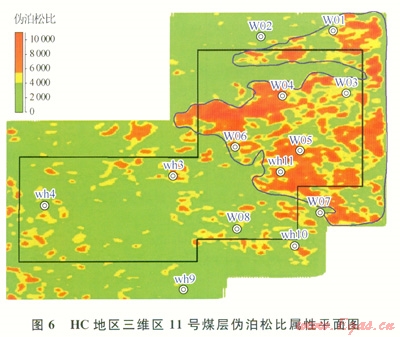 基于上述偽泊松比與煤的裂縫發(fā)育程度正相關(guān)的理論和實(shí)驗(yàn)研究,提取該區(qū)偽泊松比屬性(圖6),圖中紅色代表偽泊松比值大,推測藍(lán)色多邊形圈定的區(qū)域裂縫發(fā)育。同時(shí)把ll號(hào)煤層偽泊松比屬性和滲流曲線進(jìn)行對(duì)比發(fā)現(xiàn),滲流值較大的區(qū)域?qū)?yīng)于偽泊松比值大的范圍,因而可以推測這個(gè)區(qū)域?yàn)?span lang="EN-US">11號(hào)煤層滲透性較好的區(qū)域。