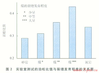 Gregory發(fā)現(xiàn)巖石的裂縫引起縱橫波速度比和泊松比的增大[7]。Ramos and Davis實(shí)驗(yàn)測試表明新墨西哥州Cedar Hill Field的煤層樣品泊松比和裂縫密度有關(guān)[8-9](圖2),可以看出煤層的泊松比隨著裂縫密度由低到高增加了30%。當(dāng)然實(shí)驗(yàn)室測量結(jié)果不等同于現(xiàn)場煤層的割理情況,但是圖2所揭示的泊松比和煤層裂縫密度之間的關(guān)系是可靠的,可用于現(xiàn)場煤層泊松比和裂縫密度的預(yù)測,即煤層的泊松比和裂縫密度為正相關(guān)。在AVO理論中,假定vp/vs=2,偽泊松比反射率(Ds/s)等于截距與梯度之和的一半[9],反映的是反射界面兩側(cè)介質(zhì)的泊松比差值,與泊松比是呈正相關(guān)的。因此,AVO反演得到的偽泊松比反射系數(shù)屬性可以用于指示裂縫發(fā)育特征,偽泊松比值大,則裂縫發(fā)育程度高。