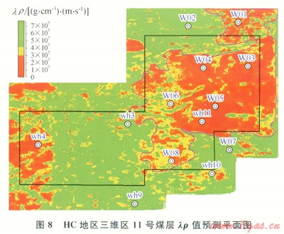 如前所述,lr值與含氣量存在負(fù)相關(guān)。在11號(hào)煤層lr值平面圖(圖8)上紅色代表lr值大,對(duì)應(yīng)含氣量高,因而工區(qū)中東部粉色多邊形范圍為11號(hào)煤層含氣量高的區(qū)域(這里不考慮埋深大于1200m的西部區(qū)域),為該層煤層氣開采首選區(qū)域。