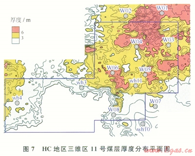 在地質(zhì)統(tǒng)計(jì)學(xué)反演基礎(chǔ)上編制完成11號(hào)煤層厚度平面圖(圖7),從圖上可以看出11號(hào)煤層在工區(qū)西南部尖滅,東部和北部發(fā)育較厚,圖中黃色和紅色區(qū)域煤層厚度大于3m,是煤層氣開采的有利區(qū)域。
