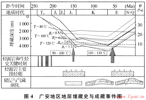根據(jù)川中廣安地區(qū)包裹體均一溫度分析,須四段氣藏包裹體的均一溫度主要分為90~100℃與110~130℃2個(gè)帶,且高溫帶數(shù)量占明顯優(yōu)勢,進(jìn)一步分析得知,高溫包裹體冰點(diǎn)溫度很低,反映含鹽度較高,主要賦存于石英微裂隙中,認(rèn)為其是在晚期的構(gòu)造抬升階段形成的,從而證實(shí)了構(gòu)造抬升對(duì)油氣大面積成藏的重要建設(shè)性作用(圖4)。