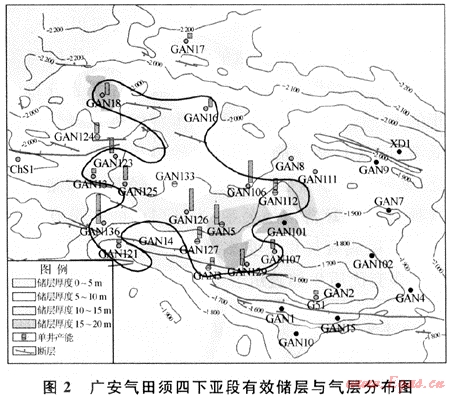 從廣安須四、須六段氣藏的平面與縱向分布特征可以看出,廣安氣田氣藏的分布范圍主要受有效儲(chǔ)層的控制,不受構(gòu)造起伏的影響,屬于巖性或構(gòu)造巖性氣藏。但構(gòu)造高點(diǎn)與有效儲(chǔ)層的配合可以提高產(chǎn)能。須六段氣藏雖然分布在廣安構(gòu)造高部位及其斜坡,主要與其有效儲(chǔ)層的分布范圍相一致,而有效儲(chǔ)層的形成主要受儲(chǔ)層沉積和成巖演化的控制。須四段氣藏的分布則基本不受構(gòu)造起伏的控制,由圖2可以看出,有效儲(chǔ)層同樣分布的東部是構(gòu)造高部位,但沒有氣層分布。而西部構(gòu)造地勢低洼,則是氣層分布的主要范圍。