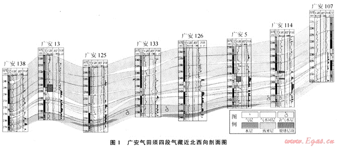 廣安氣田含氣層系主要為須四段和須六段,其疊加起來的探明儲(chǔ)量超過了1300×108m3,含氣回積達(dá)到了800km2,但由于儲(chǔ)層低孔低滲,成巖作用強(qiáng)烈,導(dǎo)致儲(chǔ)層和致密砂巖間互分布[6~7]。致密砂巖的排替壓力高,成為氣藏內(nèi)部的分割層,從而將須四段和須六段氣藏在縱向和橫向上分割成數(shù)個(gè)小氣藏,它們相互獨(dú)立,具有不同的氣水和溫壓系統(tǒng),是川中地區(qū)大面積成藏的典型代表。