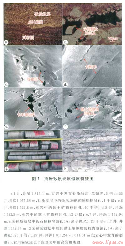 砂質(zhì)紋層廣泛發(fā)育原生粒間孔和次生溶蝕孔。原生粒間孔主要是碎屑顆粒粒間孔與黏土礦物粒間孔。碎屑顆粒粒間孔在砂質(zhì)紋層中極為常見,該類孔隙的孔隙形態(tài)多呈不規(guī)則的多邊形,直徑以微米級至幾十微米為主(大孔級)(圖2-a、2-b)。黏土礦物粒間孔是黏土礦物(主要是伊利石與綠泥石)圄成的孔隙空間,掃描電鏡下常見長軸形和等軸形2種形態(tài)(圖2-c、2-d)。長軸形由于壓實(shí)的影響而呈“縫”狀,其孔徑大小可達(dá)數(shù)十納米(中孔級),一般沿黏土礦物層理呈定向分布;等軸形是黏土礦物顆粒在強(qiáng)水動力環(huán)境堆積而成的粒間孔,或者是黏土絮凝物在靜水環(huán)境殘留下來的殘余孔(一般為大孔級),分布較雜亂。次生溶蝕孔一般發(fā)育在長石及碎屑顆粒的粒間填隙物內(nèi)(圖2-c、2-f),包括粒間孔、粒內(nèi)孔和鑄??祝粤ig孔為主。粒間孔形態(tài)各異,常見港灣狀溶蝕邊緣,直徑以數(shù)十至數(shù)百納米為主(中孔級);粒內(nèi)孔多納米級(小孔級);鑄??装w粒間易溶物鑄模和顆粒鑄模,孔徑變化較大。砂質(zhì)紋層還發(fā)育構(gòu)造裂縫,裂縫面比較粗糙,以高角度縫為主,產(chǎn)狀不穩(wěn)定(圖2-g、2-h)。