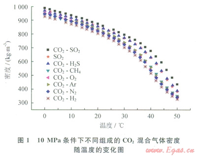 從圖l可以看出,與純CO2相比,SO2是唯一增加CO2混合氣體密度的組分,H2S對(duì) CO2混合氣體密度影響最小,而H2對(duì)CO2混合氣體密度影響最大。