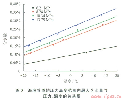 水在氣態(tài)和密相CO2中的溶解度都是有限的。水在CO2中的溶解度實(shí)際上是壓力和溫度的函數(shù),同時(shí)受雜質(zhì)含量的影響。CO2混合氣體輸送過(guò)程中含水量超過(guò)水的溶解度極限時(shí),管內(nèi)會(huì)析出游離水。游離水的出現(xiàn)會(huì)對(duì)CO2輸送管道的設(shè)計(jì)操作、腐蝕及水合物生成產(chǎn)生負(fù)面影響。