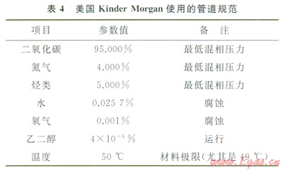 日前運(yùn)行的管道中所輸送的CO2混合物及對(duì)純度和含水量的規(guī)定等都不盡相同。國(guó)際上對(duì)于管道系統(tǒng)輸送CO2混合氣體的組成要求沒(méi)有統(tǒng)一的標(biāo)準(zhǔn)?;旌蠚怏w的組成要求很大程度上取決于設(shè)計(jì)階段進(jìn)行的評(píng)估,包括流動(dòng)安全、管道完整性、安全性及終端用戶對(duì)CO2純度的需求。美國(guó)Kinder Morgan使用的管道規(guī)范見(jiàn)表4[12]。