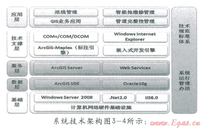 技術(shù)支撐層包括COM+/COM/DCOM,Windows Internet Explorer,ArcGIS-Maplex,嵌入式開發(fā)引擎等。