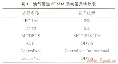 SCADA數(shù)據(jù)傳輸使用的通信協(xié)議,應(yīng)能保證數(shù)據(jù)在限定時間內(nèi)正確送達(dá)。根據(jù)美國燃?xì)鈪f(xié)會(AGA)發(fā)布的AGA-12:1標(biāo)準(zhǔn)[6],SCADA系統(tǒng)中使用的協(xié)議有近200個,大都是由不同廠商研發(fā)提供的私有協(xié)議。經(jīng)過多年的發(fā)展,一些開放的標(biāo)準(zhǔn)協(xié)議在工業(yè)界得到廣泛應(yīng)用。表1中列舉了油氣管道SCADA系統(tǒng)中最常用的幾種標(biāo)準(zhǔn)協(xié)議。