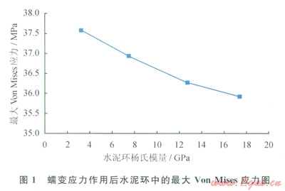 在以往關(guān)于蠕變地應(yīng)力對(duì)封固系統(tǒng)受力狀態(tài)影響的研究中,建立的封固系統(tǒng)模型通常包括套管、水泥環(huán)和地層3個(gè)部分,將蠕變地應(yīng)力施加于地層外側(cè)[19-20]。工程實(shí)際中,蠕變地應(yīng)力最終直接作用于水泥環(huán)上[15],與上述建立的模型有所差別。本研究根據(jù)工程實(shí)際情況,建立的封固系統(tǒng)模型只包括套管和水泥環(huán)兩部分,將蠕變地應(yīng)力直接施加于水泥環(huán)外側(cè)。井眼直徑取為215.9mm,套管內(nèi)外徑分別取為l57.1mm177.8mm,套管楊氏模量及泊松比分別取為210GPa0.26,水泥環(huán)泊松比取為0.19,變化水泥環(huán)楊氏模量分別為3.32GPa(水泥漿密囊1.57gcm3,無圍壓,抗壓強(qiáng)度16.4MPa)7.49GPa(水泥漿密度1.79gcm3,無圍壓,抗壓強(qiáng)度21.2MPa)、l2.73GPa(水泥漿密度1.85gcm3,圍壓5MPa,抗壓強(qiáng)度27.1MPa)17.45GPa(水泥漿密度1.9gcm3,圍壓20MPa,抗壓強(qiáng)度34.3MPa)。一界面和二界面處的初始擠壓應(yīng)力分別設(shè)為2MPa3MPa,蠕變地應(yīng)力取為40MPa。利用ANSYS軟件建模和計(jì)算封同系統(tǒng)中的應(yīng)力,選擇Von Mises準(zhǔn)則汁算得到水泥環(huán)中的最大應(yīng)力(位于水泥環(huán)內(nèi)側(cè))(1)。
