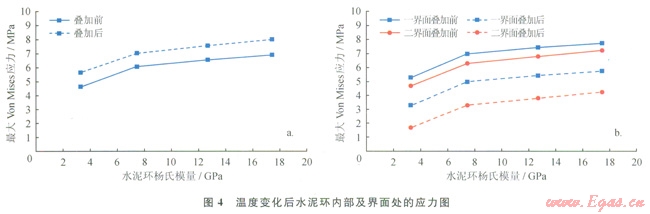 由圖4-a圖看出,水泥環(huán)內(nèi)的最大Von Miscs應(yīng)力隨水泥環(huán)楊氏模量的增大而增大;與初始應(yīng)力替加后,Von Mises應(yīng)力增大為4.48.0MPa,小于普通水泥環(huán)的屈服強(qiáng)度。所以,當(dāng)溫度變化幅度不大時(shí),水泥環(huán)通常不會(huì)發(fā)生屈服破壞,但溫度升高幅度較大時(shí)水泥環(huán)可能會(huì)發(fā)生屈服破壞。因此,對(duì)熱采井等應(yīng)避免使用膨脹水泥漿,且應(yīng)使用低楊氏模量的水泥環(huán)。由圖4-b可以看出,與初始應(yīng)力疊加前,一、二界面在徑向上受拉伸應(yīng)力的作用且應(yīng)力隨水泥環(huán)的楊氏模量增大而增大,為4.48.0MPa,遠(yuǎn)大于一、二界面膠結(jié)的抗拉強(qiáng)度,會(huì)破壞一、二界面膠結(jié);與初始應(yīng)力疊加后,徑向應(yīng)力顯著降低至1.46.0MPa,降低了一、二界面膠結(jié)破壞的風(fēng)險(xiǎn)。因此,通過降低水泥環(huán)楊氏模量和增大初始應(yīng)力都可以降低界面膠結(jié)破壞的風(fēng)險(xiǎn),建議采用較低楊氏模量的水泥環(huán)或使用膨脹水泥來預(yù)防失效。