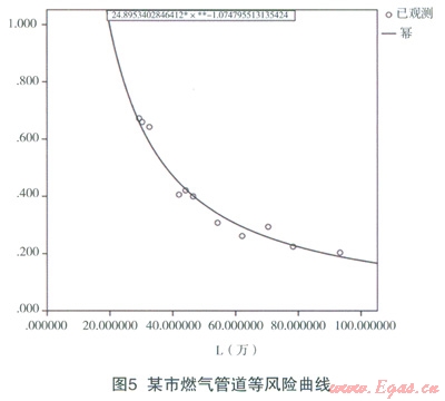 (2)對上述數(shù)據(jù)用回歸分析法進行擬合,可得該城市的等風險曲線,如表1和圖5所示,運算結果為R=P*L=24.765,即該城市燃氣管道風險值為24.765。