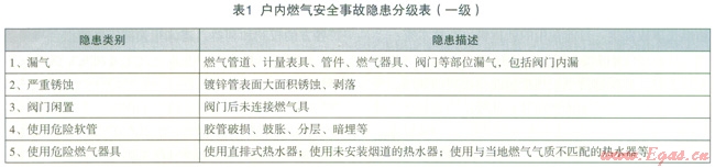 以筆者所在單位為例,目前將戶內(nèi)燃氣安全隱患分為三級,一級隱患風(fēng)險等級最高,共5類,如表l所示。