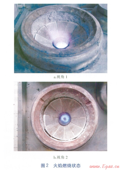 新型炒菜灶的結(jié)構(gòu)見圖1,火焰燃燒狀態(tài)見圖2。主要由燃氣一空氣預混器、灶具本體、燃燒器、扇形多孔聚能陶瓷板、送風機等組成。燃燒器的內(nèi)壁開有能使可燃混合氣旋流噴出的旋流火孔,方向為軸向順時針傾斜15°并且切向傾斜向上15°,孔徑為2.5mm。