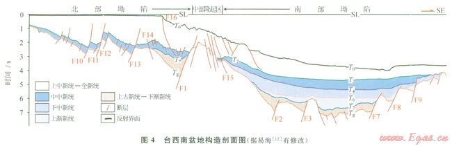 臺(tái)西南盆地的中部隆起緊鄰盆地的南、北坳陷”(圖4)。新生代以來自下而上發(fā)育古近系(古新統(tǒng)、始新統(tǒng)、漸新統(tǒng))、新近系(中新統(tǒng)、上新統(tǒng))和第四系。盆地?fù)碛兄猩?、古新統(tǒng)始新統(tǒng)、上新統(tǒng)—中中新統(tǒng)、上中新統(tǒng)更新統(tǒng)共4套氣源巖,有機(jī)質(zhì)成熟度高,多為腐殖型干酪根,氣源條件較好[11]。研究區(qū)水合物藏主要發(fā)育于上中新統(tǒng)一第四系全新統(tǒng)。