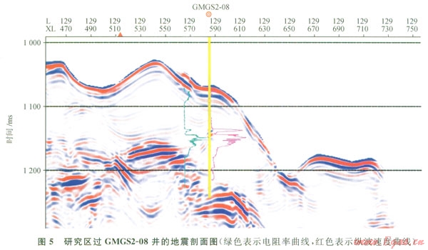 通過合成記錄,可以將GMGS2-08井的測(cè)井曲線疊加到地震剖面上(圖5)。從圖5中的聲波測(cè)井曲線可以看出,BSR是一個(gè)明顯的速度分界面,附近地層存在著明顯的速度倒轉(zhuǎn)現(xiàn)象(圖5),即BSR之上為速度相對(duì)較高的含水合物層,之下則為聚集的低速游離氣層,這與正常沉積地層自淺至深速度逐漸增大剛好相反[20]。BSR這一速度特征與含天然氣水合物的“游離氣體帶”模型非常吻合[13],而BSR的橫向變化則可能指示天然氣水合物呈層狀分布,以厚層塊狀的形式分布于水合物穩(wěn)定帶內(nèi)的高速層中。