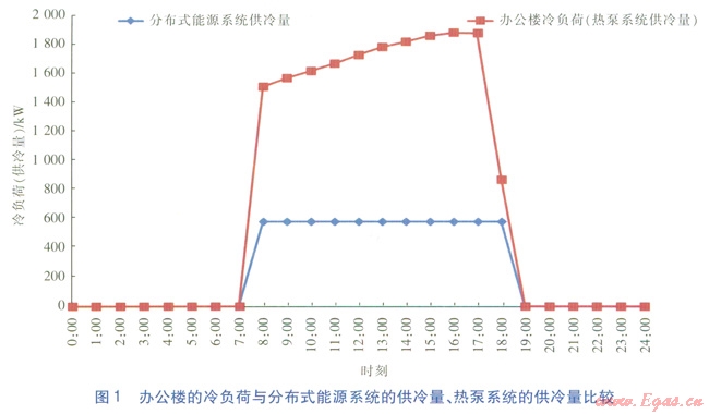 辦公樓在供冷期白天工作時段(8:00—18:00)的平均冷負(fù)荷為1650kW,最大冷負(fù)荷為1879kW,最小冷負(fù)荷為869kW。夜間冷負(fù)荷按0kW估算。辦公樓的冷負(fù)荷與分布式能源系統(tǒng)的供冷量、熱泵系統(tǒng)的供冷量比較見圖1(熱泵系統(tǒng)的供冷量與冷負(fù)荷一致)。