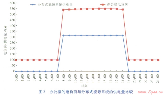 辦公樓白天工作時段(8:00—18:00)的平均電負(fù)荷(不包括制冷用電負(fù)荷)為546kW,非工作時間內(nèi)電負(fù)荷均按照100kW估算,辦公樓的電負(fù)荷與分布式能源系統(tǒng)的供電量比較見圖2。