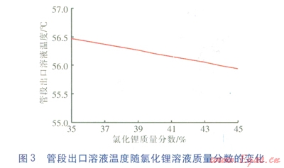 氯化鋰溶液的常用質(zhì)量分?jǐn)?shù)范圍為35%~45%,以管段1-0為例,當(dāng)其他條件不變時(shí),管段出口溶液溫度隨氯化鋰溶液質(zhì)量分?jǐn)?shù)的變化見圖3。由圖3可知,在計(jì)算工況下,氯化鋰溶液質(zhì)量分?jǐn)?shù)越高,溶液溫降越大。