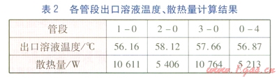 由單管溫降模型、單管散熱模型計(jì)算得到的各管段出口溶液溫度、散熱量見表2。由管網(wǎng)仿真模型計(jì)算得到節(jié)點(diǎn)0處溶液溫度為57.38℃,溶液質(zhì)量分?jǐn)?shù)為40.18%。