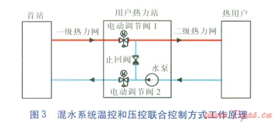 混水系統(tǒng)溫控和壓控聯(lián)合控制方式工作原理見(jiàn)圖3,在一級(jí)熱力管網(wǎng)供水管上設(shè)置壓力控制的電動(dòng)調(diào)節(jié)閥1,在一級(jí)熱力管網(wǎng)回水管上設(shè)置溫度控制的電動(dòng)調(diào)節(jié)閥2。壓力控制是通過(guò)檢測(cè)二級(jí)熱力管網(wǎng)回水壓力,來(lái)調(diào)節(jié)一級(jí)熱力管網(wǎng)供水管上的電動(dòng)調(diào)節(jié)閥1開(kāi)度,使二級(jí)熱力管網(wǎng)回水壓力滿足所供小區(qū)基本的定壓要求。當(dāng)二級(jí)熱力管網(wǎng)的回水壓力低于該用戶熱力站所需的定壓值時(shí),電動(dòng)調(diào)節(jié)閥1開(kāi)度增大;當(dāng)二級(jí)熱力管網(wǎng)的回水壓力高于該用戶熱力站所需的定壓值時(shí),電動(dòng)調(diào)節(jié)閥1開(kāi)度減小。溫度控制的電動(dòng)調(diào)節(jié)閥2通過(guò)檢測(cè)二級(jí)熱力管網(wǎng)供水溫度是否滿足設(shè)定值來(lái)調(diào)節(jié)開(kāi)度,當(dāng)二級(jí)熱力管網(wǎng)的供水溫度低于設(shè)定值時(shí),增大電動(dòng)調(diào)節(jié)閥2開(kāi)度;反之,減小電動(dòng)調(diào)節(jié)閥2開(kāi)度。通過(guò)溫控和壓控聯(lián)合控制的方式,一方面穩(wěn)定了混水系統(tǒng)的壓力,杜絕氣體由于壓力波動(dòng)而析出;另一方面也滿足了溫度控制的要求。