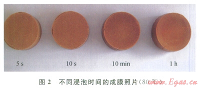 將人造巖心放入濃度為300kg/m3的成膜液中(80℃)浸泡5s、10s、10min和1h,分別取出后干燥,觀察成膜情況,不同浸泡時間成膜液的成膜情況如圖2。