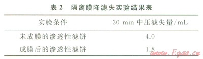 用水基鉆井液壓制成滲透性濾餅進行清水滲透性實驗,評價防水滲膜防自由水滲透的效果。實驗結(jié)果見表2。