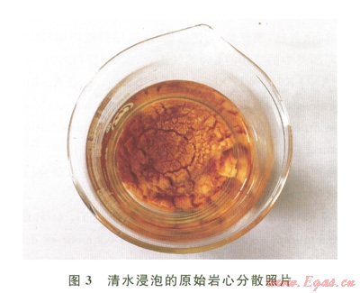 將原始巖心與成膜后的巖心分別放入清水中浸泡24h,原始巖心由于水化分散明顯(圖3),有防水滲膜后的巖心由于有致密的防水滲膜保護,未出現(xiàn)水化分散現(xiàn)象(圖4),說明所形成的防水滲隔膜不能被清水溶解。